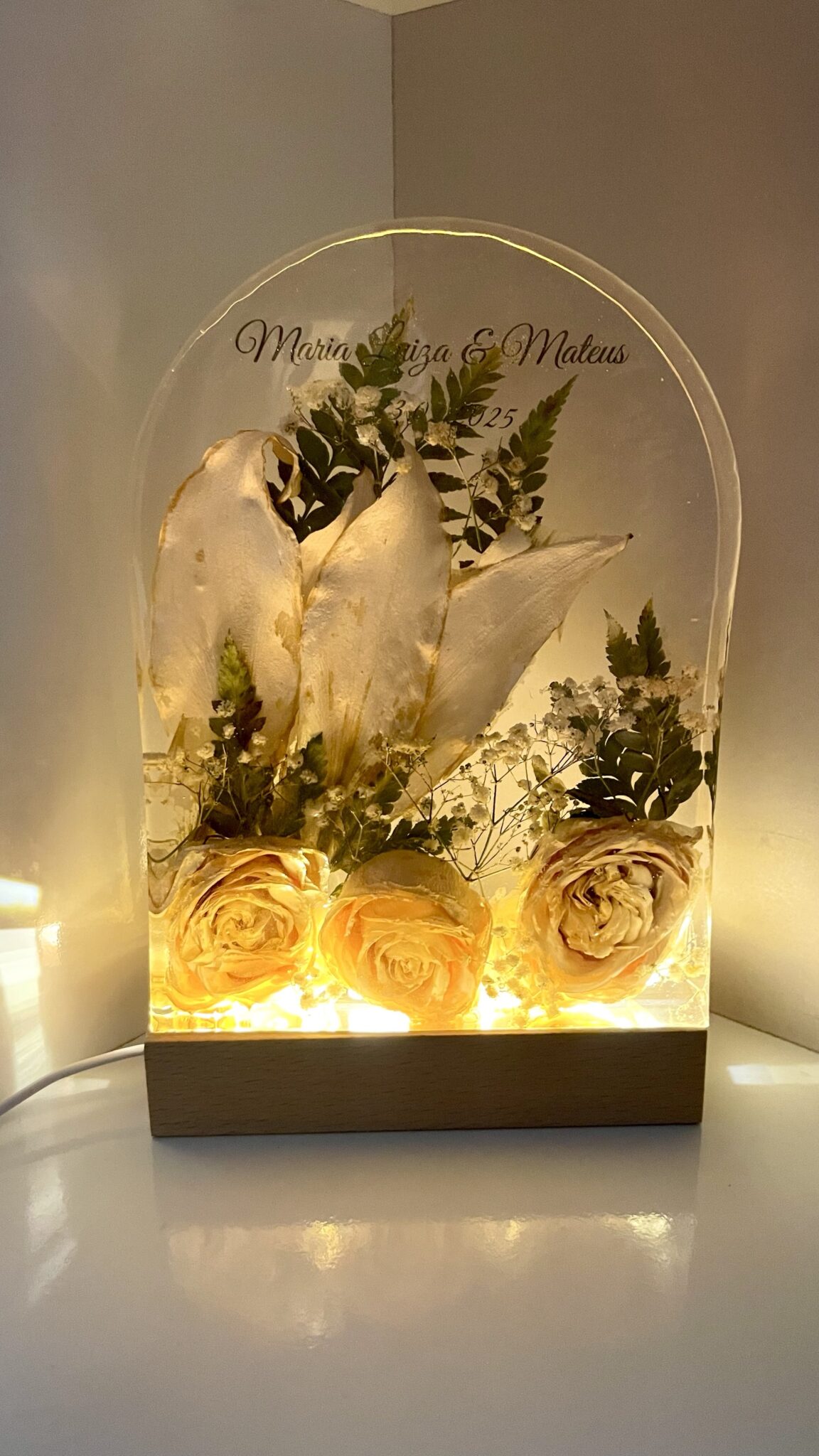 Nosso portal decorativo é perfeito para acomodar suas flores no formato 3D. Pode ser personalizado do jeitinho que você quiser. Caso você queira adicionar mais itens além das flores, será combinado no nosso atendimento por WhatsApp após a compra.